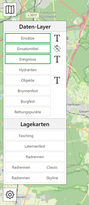 Die Layer Einsätze, Einsatzmittel und Ereignisse werden regelmäßig aktualisiert, so dass Änderungen automatisch dargestellt werden. Gezeichnete Layer und Layer von Lagekarten können nur in einem Lesezugriff dargestellt und nicht editiert werden. In ihnen werden nur gezeichnete Objekte und taktische Zeichen aus dem TZ-Generator dargestellt. Das Darstellen von eingefügten Bildern ist nicht möglich. Unwettereinsätze werden entsprechend ihrer Priorität mit einem farbigen Marker (grün, gelb, rot) versehen.