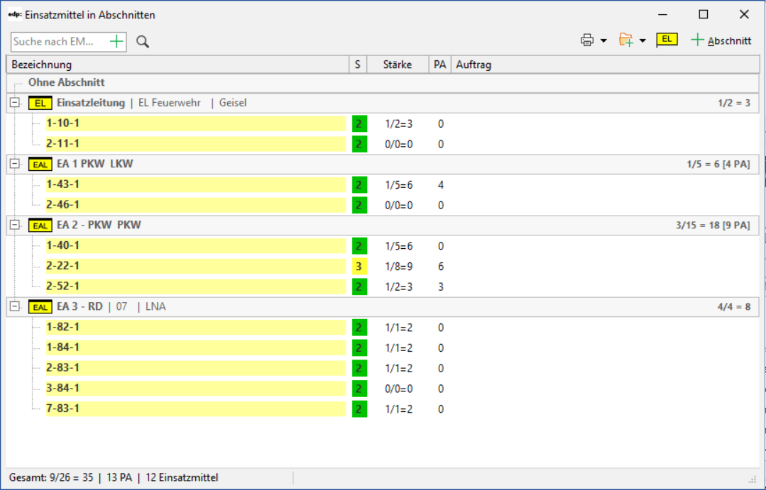Für das Arbeiten im ELW ist die beschriebene Fensteranordnung von edp:desk so darauf ausgelegt, eine punktuelle Lage mit einem Schadensereignis abzuarbeiten. Aus diesem Grund erfolgt hier die Darstellung der Einsatzmittel in einer speziellen Listenansicht, in der auch die Einsatzabschnitte mitsamt der Fahrzeugzuordnung visualisiert werden.