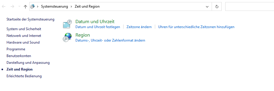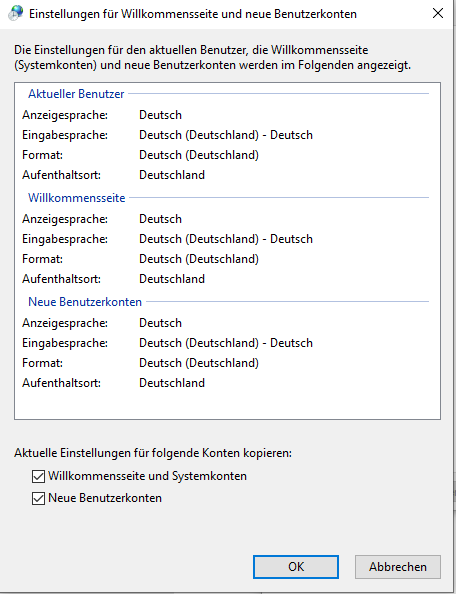 Da die Windows-Dienste unter dem Systembenutzer ausgeführt werden, kann es zudem auch vorkommen, dass für den Admin-Benutzer die Ländereinstellungen auf Deutsch gesetzt sind, für den Systembenutzer und dementsprechend dann für die Dienste aber noch auf Englisch stehen.