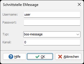 Mit dieser Schnittstelle kann der EDP-Server Alarmierungen an Geräte der Firma eMessage senden. Die Alarme werden im edp:desk als Aufgabe ausgeführt und müssen als POCSAG-Alarm im Aufgabentyp definiert werden. Dabei ist im Feld „RIC“ die Nummer des zu alarmierenden Melders anzugeben. Der Alarmtext kann frei inkl. der Platzhalter aus den Protokolltags definiert werden (z.B. „Alarm: <%STICHWORT_KLARTEXT%> - <%STRASSE%> <%HAUSNUMMER%>, <%ORT%>).