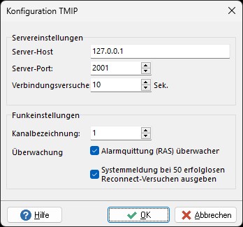 Im Konfigurations-Dialog müssen die Verbindungsdaten zum Swissphone Software eingetragen werden. Die Kommunikation erfolgt über TCP/IP.